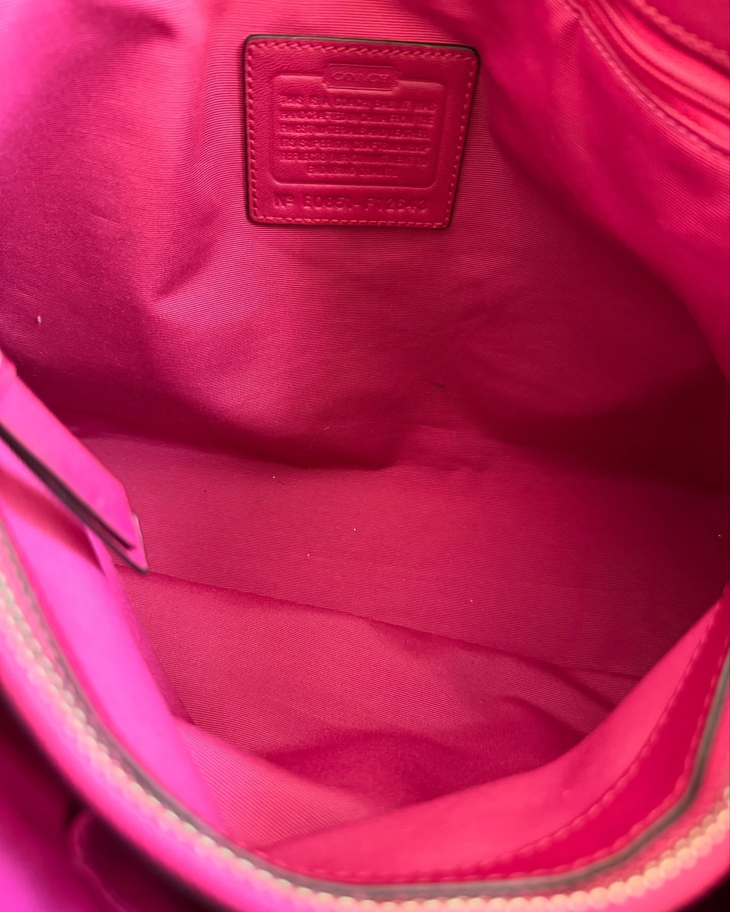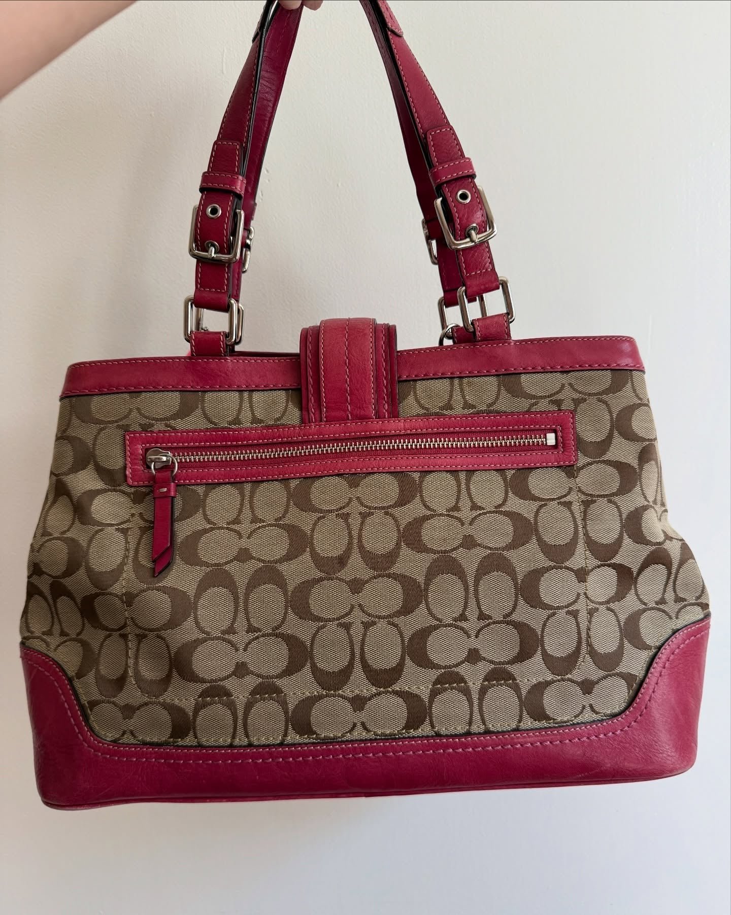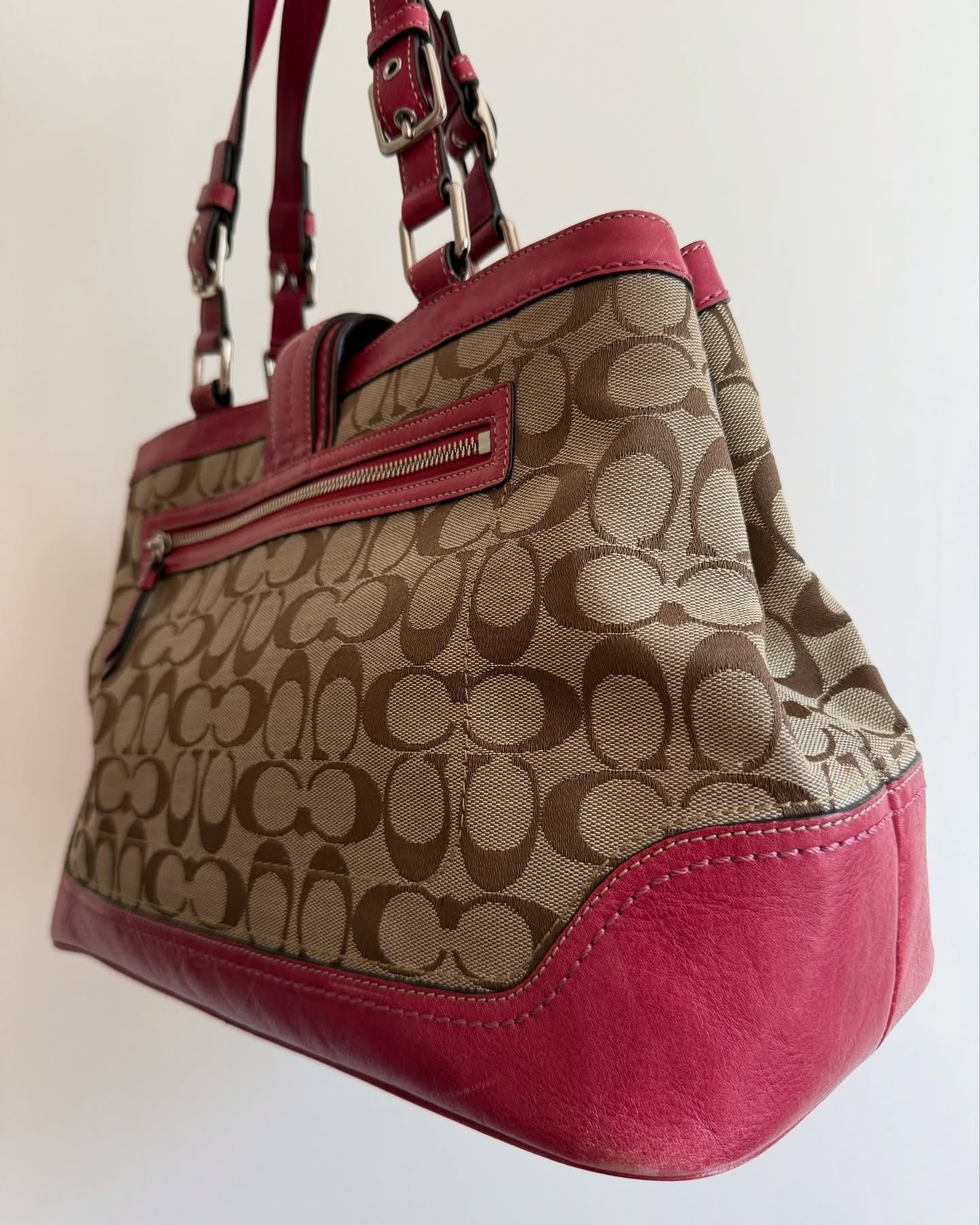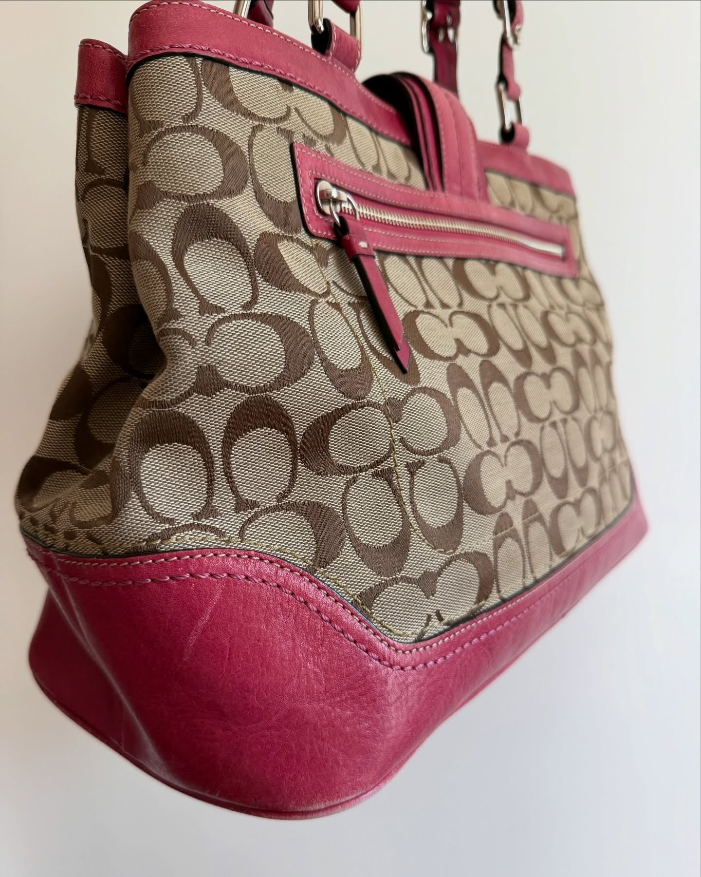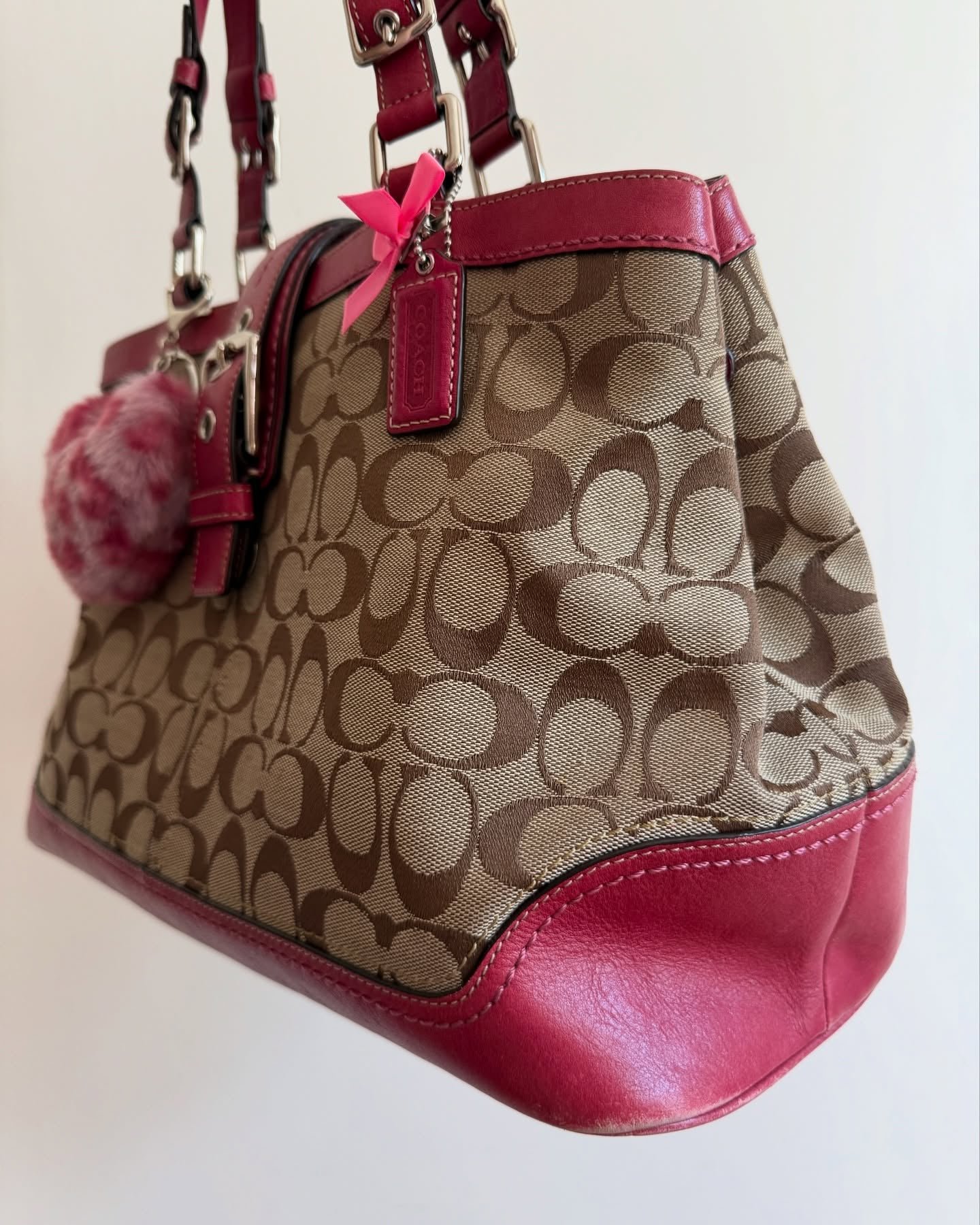 vintage authentic coach tan signature shoulder bag with pink leather and magnetic closure 🩷